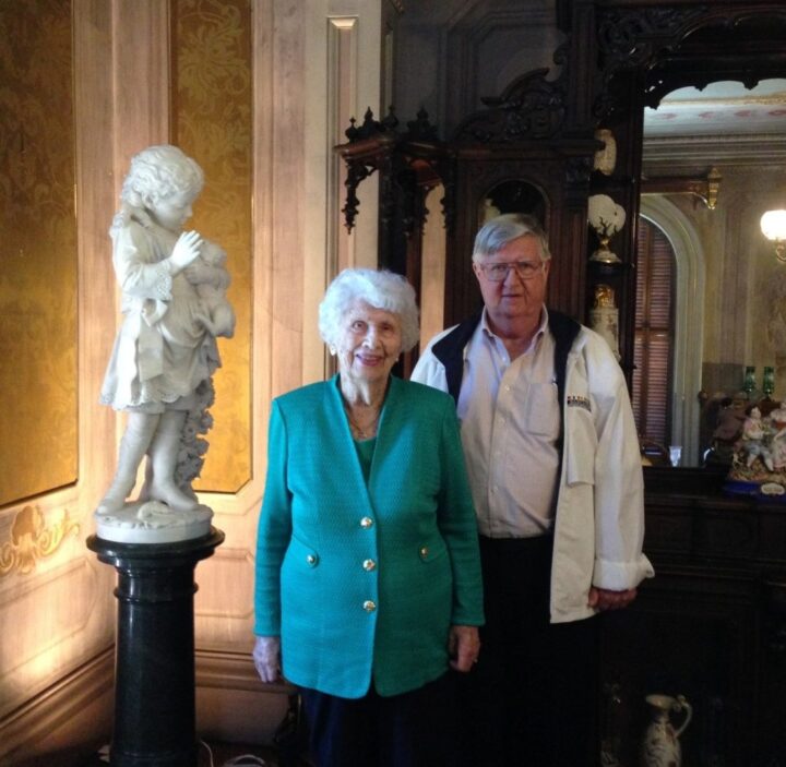 Ellen Libby Lawrence, the sole surviving grandchild of J.R. Libby, visited the Mansion in late August with her son Franklin, a former Mansion trustee. A generous supporter of Victoria Mansion for decades, Ellen has donated original Morse and Libby objects and provided information about the Libby family that is critical to our interpretation of the Mansion. The daughter of Ralph G. and Hattie Libby, Ellen grew up in Portland’s West End.  After her mother’s death she was instrumental in arranging the donation of original Mansion furnishings that were in her family home, including the Herter parlor suite and center table and the dining room furniture.