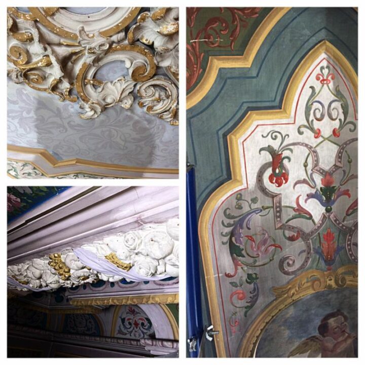 Conservators are also reattaching the gold leaf and gilded elements of the decorative plaster work with a special adhesive, and cleaning painted wood window and door frames with citric acid and a saliva rinse. (Yes saliva, you read it right! It is in fact recognized as a powerful conservation tool.) We are currently waiting on a paint analysis to tell us more about the layers of dirt, pigment, paint and plaster that may not be visible to the naked eye. We will give you frequent updates as this exciting project progresses!