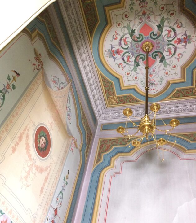 Much has happened with our major conservation project in the Reception Suite since our last update in April. After completing the cleaning of the ceiling decoration, the conservators sprayed a layer of stable, synthetic resin to preserve and protect the original surfaces. Then, on top of this barrier, they inpainted losses in the ochre-colored areas and applied 23-carat shell gold where it was missing.