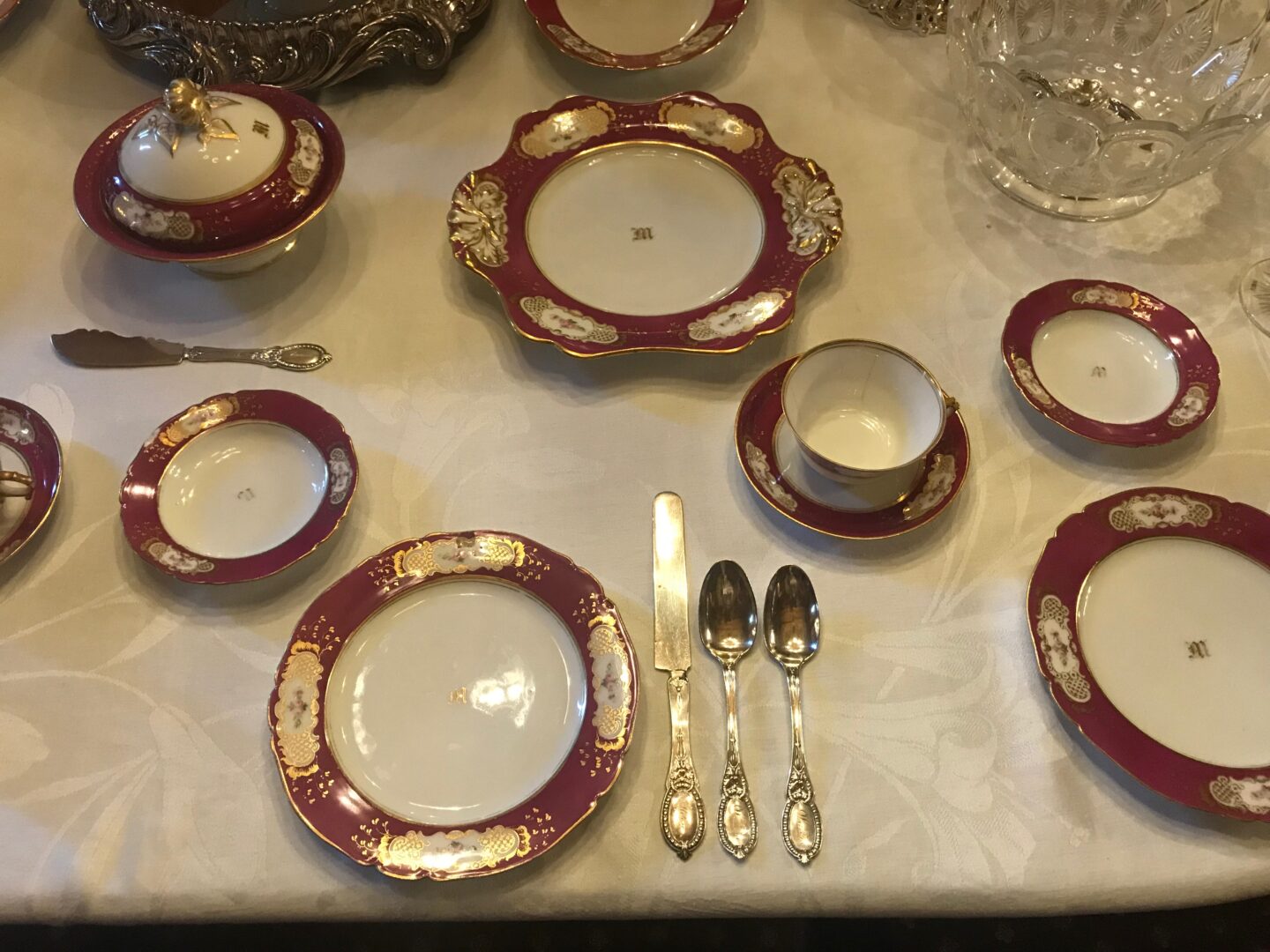 The delicate painted rose decoration of the service matches that of the dinner service, but the border of the tea service is a rich maroon-red while the dinner service has an apple-green border. The set was originally for twenty-four, and comprises teacups and saucers, serving platters and plates, butter dishes, sauce dishes for jam, sauce, or honey, and seven-inch tea plates for such fare as scones, toast, and finger sandwiches. This summer, Curator Arlene Palmer Schwind has set the dining table with the red porcelain service, pairing it with the Libby family’s silver-plate tea service of 1871 that is displayed upon the Morses’ Sheffield silver plate tray.