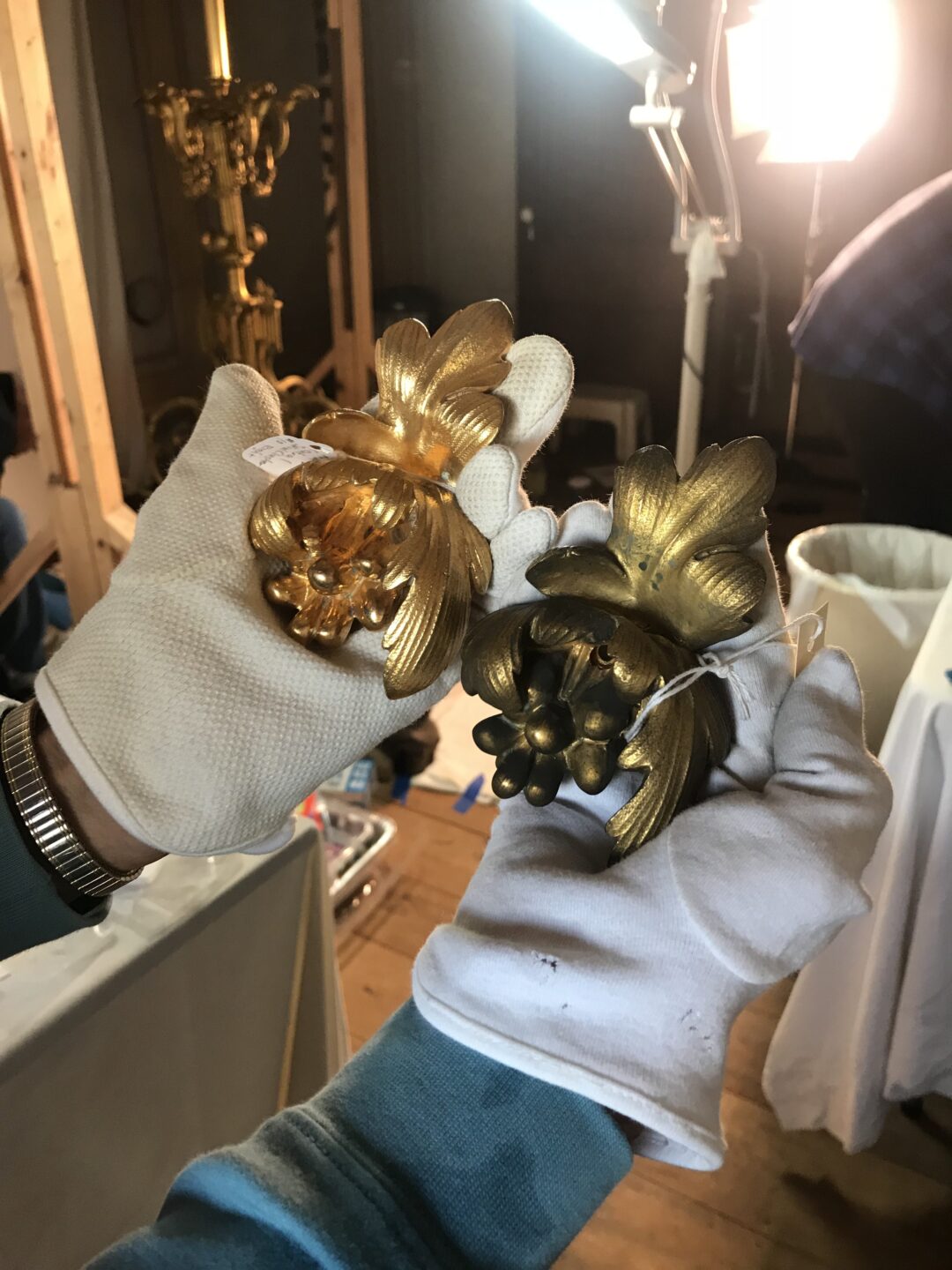 Conservators Siobhan Lindsay and Harper Batsford, and volunteers John and Eunice Wilcox are currently working to conserve the Reception Room’s original, monolithic gilded bronze gasolier (gas lighting fixture). The first step in this arduous process is the careful dismantling and labeling of each piece of this elaborate Rococco-inspired fixture, a total of 225 pieces in all! Throughout the fixture, there are elaborately cast grapes and grape leaves (a stylistic nod to the Bacchanalian references throughout the Reception Suite), acanthus leaves, and a myriad of other classical elements.