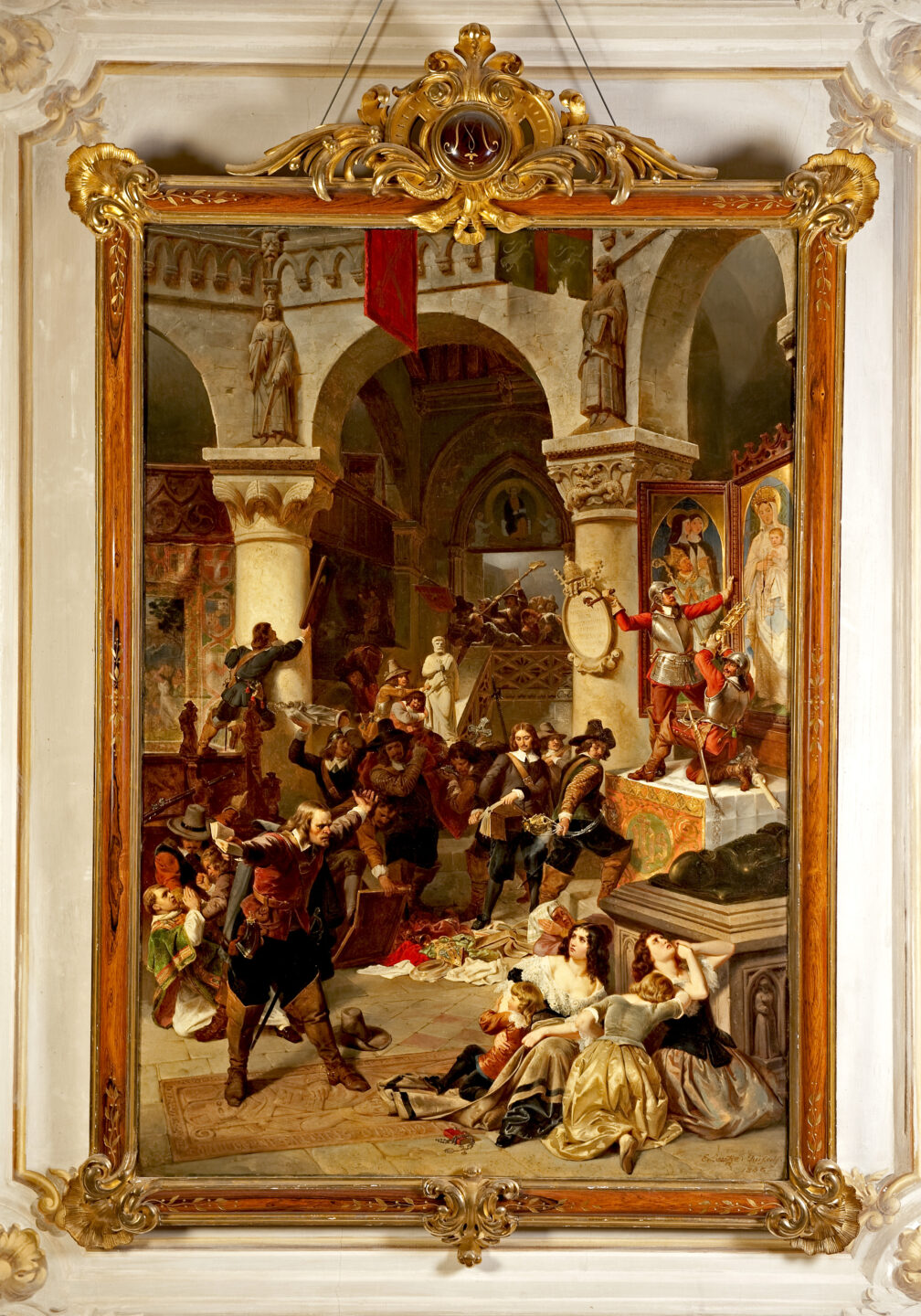As is clear from the complex iconography throughout the Mansion’s décor, however, Morse possessed a liberal imagination that may have resonated to the emotional appeal of ‘The Iconoclasts’, in spite of any ideological differences with the painter. Critics have long suggested that Leutze’s sympathies in the painting are with the grief-stricken Catholic women witnessing the smashing of sculptures and paintings. The Protestant soldiers display “fanaticism and intolerance,” according to Yale Professor Sally M. Promey, behavior seen by the painter as a “threat to liberty.”