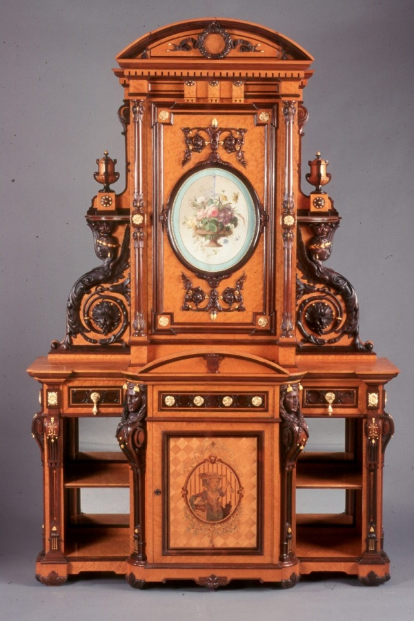 Victoria Mansion’s assemblage of furniture, window cornices, and mirror and picture frames is the largest collection of objects from Gustave Herter’s workshop in the United States. The figured maple and rosewood cabinet is one of the most important examples of Herter’s workmanship in the museum’s collection. It has carved, incised, painted, and inlaid ornament reflecting different stylistic influences. The winged females carved on the upper section recall designs of the baroque era. On the upper door is a floral oil painting of French neoclassical inspiration; the lower door has a rococo-style marquetry panel depicting a girl blowing bubbles.
