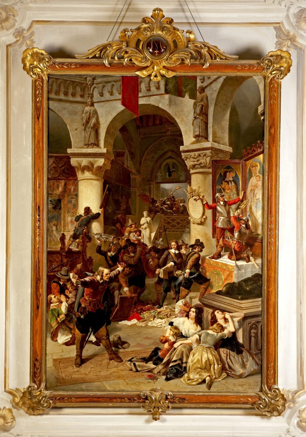 Purchased from the noted New Orleans banker and art collector James Robb, The Iconoclasts, by Emmanuel Leutze (1816-1868) hangs in the Parlor. The painting depicts the destruction of a church during the English Civil War, and was commissioned by Robb in 1846. The frame was designed by Gustave Herter (1839-1883) for this house, and it bears an “M.” Herter designed a matching frame for the other painting hanging in the Parlor, Jacob’s Dream, by Luther Terry (1813-1869), which was also purchased from Robb’s collection.
