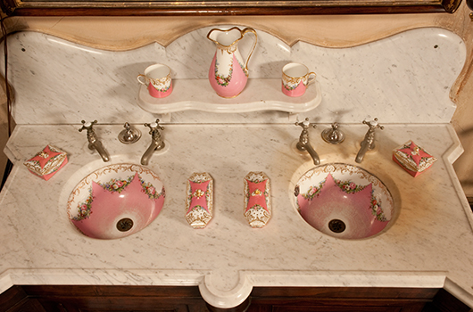 Reminiscent of those found in the hotels where Morse made his fortune. Gustave Herter designed the marble-topped vanity, into which are set painted porcelain bowls of unknown French manufacture. A vanity set in a matching pink design includes toothbrush cases, soap boxes, pitcher, cups, and a chamber pot.