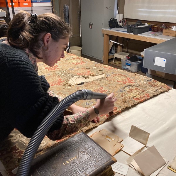 Cunningham’s introduction to museums of Portland began at the Maine Historical Society, helping with the 2020 exhibition Northern Threads, 200 Years of Dress in Maine, and as a guide of the Wadsworth-Longfellow House. This work led her to Victoria Mansion, and their extensive collection of original 1860s textiles. Today, Vivian can be found at MHS as their Visitor Services and Collections Assistant, or around Victoria Mansion as a Conservation Technician.